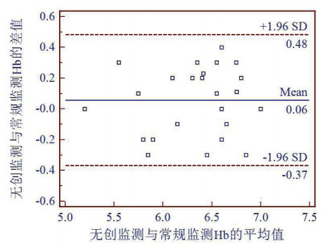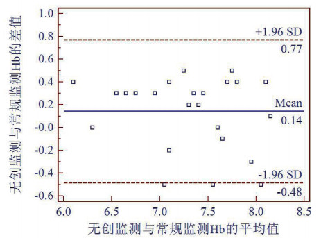 | 图 3 75例伤员输血后无创法与常规法监测血红蛋白水平的Bland-Altman图 |