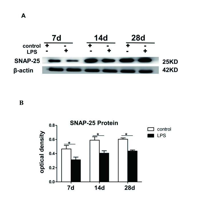 2 结果 2.1 海马组织SNAP25的表达蛋白印迹显示:与对照组相比腹腔注射LPS组在7、14、28 d海马内SNAP-25蛋白表达明显减少且差异有统计学意义(正态性检验各组P > 0.05; 7 d control组vs 7 d LPS组:t = 2.463,P < 0.05;14 d control组vs 14 d LPS组:t = 3.130,P < 0.05;28 d control组vs 28 d LPS组:t = 7.218,P < 0.05),见图 1。