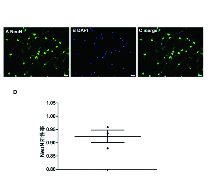 1.3.4 细胞免疫荧光及图像分析原代培养的海马神经元细胞,在PBS中漂洗三次后用4%的多聚甲醛固定15 min后10%驴血清室温封闭1 h。细胞孵育NeuN (1:200)过夜。次日,488驴抗鼠IgG(H + L)室温孵育1 h。DAPI孵育5 min后拍照观察。