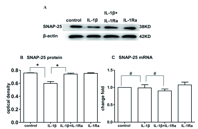 | 与IL-1β组相比, aP < 0.01;与IL-1β组相比, bP > 0.05;n=6 图 5 IL-1β对原代海马神经元内SNAP-25的蛋白和mRNA表达的影响 Fig 5 The effect of IL-1β on SNAP-25 expression in primary hippocampal neuron |