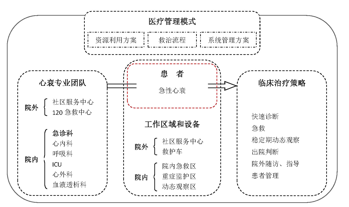 1 急性心衰单元概述 1.1 急性心衰单元的概念广义的急性心衰单元不仅是一个单纯的空间概念,还包括院前(院外)的社区医疗服务中心和120急救中心以及院内以急诊科为主导的急诊科、心内科、呼吸科、ICU、心外科、血液透析科等科室医护人员共同协作组成[13, 17-18]的心衰专业团队,以及该团队为急性心衰患者提供的包括快速诊断、急救、稳定期动态观察、出院判断、院外随访、指导及患者管理的一种综合临床治疗策略,以及可以支持实施该临床治疗策略,拥有最大化医疗和人力资源利用率,最高效救治流程和标准化系统管理相匹配的一种医疗管理模式,见图 1。