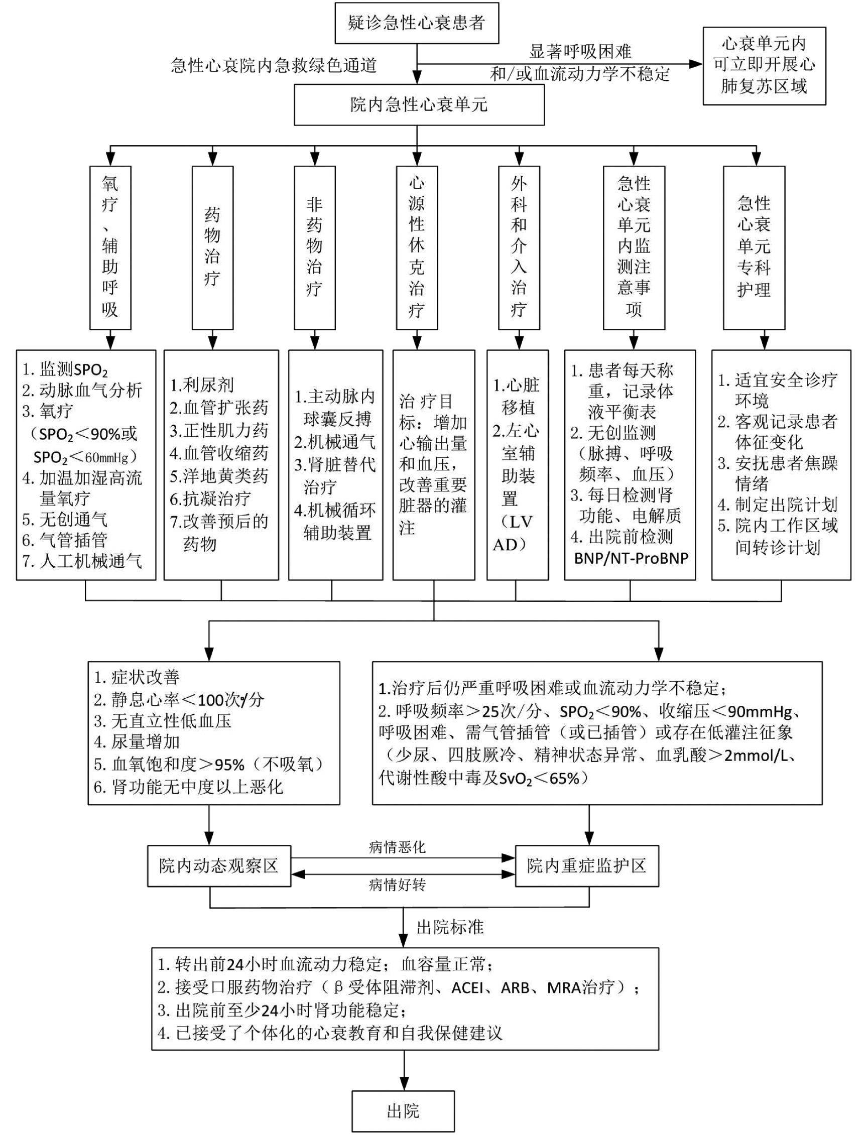 (3) 院内阶段管理。①应设置急性心衰单元院内绿色通道;②制定急性心衰的快速诊断标准和诊断流程,确立有效的转入、排除标准,参考相关指南制定心衰治疗、合并症治疗、以及原发病治疗和去除诱因的治疗流程;③制定急性心衰严重程度的判断标准和评估流程,制定重症监护环节或稳定期管理环节的转入、转出标准,以辅助制定进一步治疗方案;④制定急救环节与重症监护环节或稳定期管理环节之间的衔接方案;⑤制订出院标准;