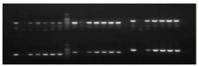 | 图 1 电泳图(SP-A1等位基因经PCR扩增后在1%琼脂糖凝胶电泳上的表达) Fig 1 Electropherogram(expression of SP-A1 allele on 1% agarose gel electrophoresis after PCR amplification) |