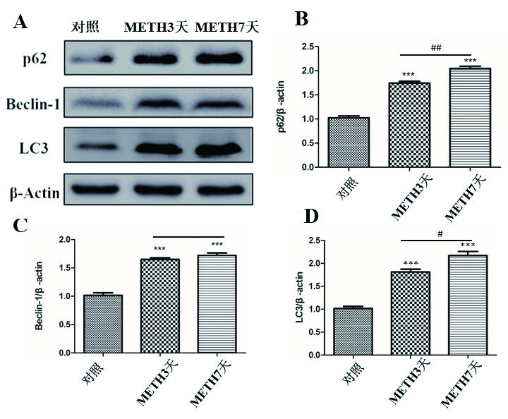 1.2 体内实验健康雄性C57Bl/6J小鼠,SPF级,5~6周龄,体质量(18±2)g,由南京医科大学动物实验中心提供(动物实验伦理证号:20110521)。所有小鼠都饲养于光/暗周期为12 h/12 h,环境温度(22±2)℃,相对湿度40%~70%的条件下,自由获得饲料和饮水。适应性饲养1周后,利用随机数字表将60只小鼠随机(随机数字法)分为3组(每组20只)。为了探究甲基苯丙胺短期过量摄入致死的可能原因,根据已有的研究设置:3 d组模拟人类急性染毒模型(小鼠给予腹腔注射单次剂量15 mg/kg的METH溶液,2次/d,连续3 d);7 d组模拟人类亚急性染毒模型(腹腔注射单次剂量相同的METH溶液,2次/d,连续7 d),已知生理盐水对于自噬的激活并无影响,为了与造模组小鼠造成的多次刺激保持操作一致。参考文献[18]中的对照处理方法,选择单一对照组连续7 d在相同时间点给予腹腔注射0.9%生理盐水。各组分别在最后一次注射后的24 h,解剖小鼠,获取心脏组织,-80℃冰箱保存备后续实验使用。