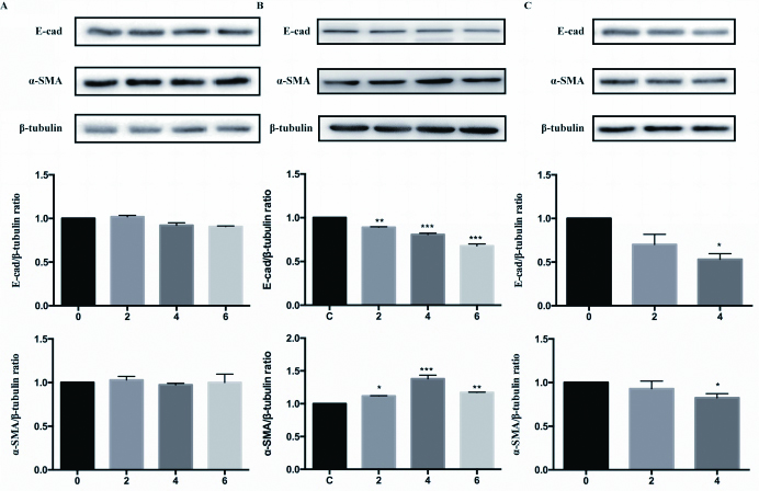 在A549细胞中加入适量ripa(sigma,美国)充分裂解20 min后离心(12 000 r/min,4 ℃,10 min),取上清,测定蛋白浓度(BCA法),加入1/4(v/v)的上样缓冲液,混匀后充分变性蛋白(100 ℃,5 min)。后将含有20 μg总蛋白的蛋白样品加入至加样孔中进行SDS-PAGE电泳。当溴酚蓝到达胶的底端处附近时结束电泳,使用Bio-Rad标准湿式转膜装置转膜(300 mA,60 min,冰浴)至0.2 μM的PVDF微孔膜(Millipore,美国)。转模结束后,将PVDF膜放置在TBST中,漂洗2 min,后用封闭液(含5 %脱脂奶粉的TBST)室温封闭1 h。封闭结束后,按照相应比例用稀释液(含5 %脱脂奶粉的TBST)稀释一抗(E-cadherin,CST #14472,1:1 000;α-SMA,Bioss bs-10196R,1:5 000;TGF-β,CST #3711,1:1 000;β-tubulin,Selleck A5032,1:1 000),4 ℃轻微摇晃孵育过夜。用TBST洗涤PVDF膜(5 min×3次)。后用封闭液稀释二抗HRP Goat Anti-Rabbit IgG(Jacksonimmuno,美国),室温轻微振荡孵育1 h,用TBST洗涤PVDF膜(5 min×3次)。将发光液均匀滴到PVDF膜上,置于Bio-rad凝胶成像系统成像,成像结果使用Image J软件扫描分析灰度值。