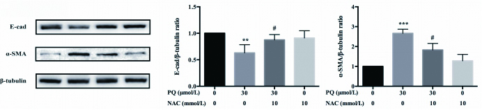 如图 2所示,预孵10 mM NAC 2 h后,与PQ组相比,NAC+PQ组的E-cadherin蛋白水平表达显著升高,α-SMA的蛋白水平表达显著下降。提示NAC可以有效逆转PQ刺激A549细胞产生的EMT。