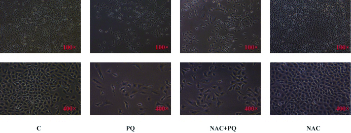 1.2 NAC对于A549细胞的预处理A549细胞按8×103/mL的密度接种,24 h后,10 mmol/L NAC孵育2 h,应用30 μmol/L PQ刺激A549细胞4 d。