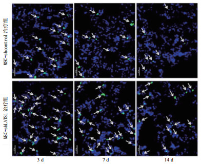 2 结果 2.1 低表达LATS1增加mMSCs在ARDS肺组织中的存留经颜色编码的荧光图像分析发现,MSC-shLATS1治疗组3、7、14 d小鼠离体肺图像信号明显高于MSC-shcontrol治疗组(P < 0.05),但其信号强度随着时间递减(图 1)。荧光显微镜检测发现MSC-shLATS1治疗组3、7、14 d小鼠肺组织内GFP阳性细胞数量明显高于MSC-shcontrol治疗组(P < 0.05),但其阳性细胞数随着时间递减(表 1、图 2)。