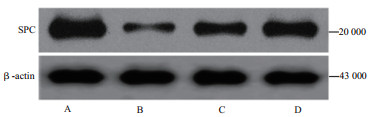 荧光显微镜下检测GFP阳性表达(绿色)及SPC阳性表达(红色)的细胞分别为mMSCs及ATⅡ细胞,双染阳性合并后呈黄色的细胞为mMSCs分化的ATⅡ细胞,结果发现MSC-shLATS1治疗组及MSC-shcontrol治疗组14 d小鼠肺组织内mMSCs及ATⅡ细胞数差异无统计学意义,但MSC-shLATS1治疗组14 d小鼠肺组织内mMSCs分化为ATⅡ细胞比例明显高于MSC-shcontrol治疗组(表 2、图 3)。Western blot检测发现MSC-shcontrol治疗组14 d小鼠ATⅡ细胞特异性标志物SPC蛋白水平表达显著高于ARDS组(P < 0.05);而MSC-shLATS1治疗组小鼠14 d SPC蛋白水平表达较MSC-shcontrol治疗组进一步增高(P < 0.05) (表 2、图 4)。