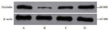 | A:正常对照组;B:ARDS组;C:MSC-shcontrol治疗组;D:MSC-shLATS1治疗组 图 5 各实验组肺上皮紧密连接蛋白Occludin表达 Fig 5 Occludin expression of alveolar epithelium in all groups |