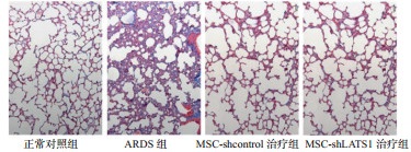 1.4 实验动物分组及处理将C57BL/6小鼠随机(随机数字法)分为4组(n=36):正常对照组、ARDS组、ARDS+空干扰病毒转染的mMSCs (MSC-shcontrol)治疗组、ARDS+转染干扰LATS1病毒的mMSCs(MSC-shLATS1)治疗组。正常对照组小鼠则向气道内注入与LPS等体积的50 μL生理盐水,4 h后再向气道内注入30 μL的PBS;ARDS组小鼠复制LPS-ARDS模型后4 h再向气道内注入30 μL的PBS;ARDS+MSC-shcontrol治疗组小鼠复制LPS-ARDS模型后4 h再向气道内注入含空干扰病毒转染mMSCs的PBS 30 μL(细胞数5×104);MSC-shLATS1组小鼠复制LPS-ARDS模型后4 h再向气道内注入含转染干扰LATS1病毒mMSCs的PBS 30 μL (细胞数5×104)。在建立LPS-ARDS模型后3、7、14 d处死小鼠,留取肺组织待检。