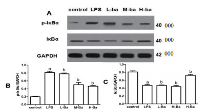 B:与control组相比,aP<0.05;与LPS组相比,bP<0.05;C:与control组相比,aP>0.05;与LPS组相比,bP>0.05 图 5 黄芩苷抑制脂多糖诱导的H9C2心肌细胞NF-κB活化(n=3) Fig 5 Baicalin inhibits lipopolysaccharide induced activation of NF-κB in H9C2 cardiomyocytes (n=3) |
