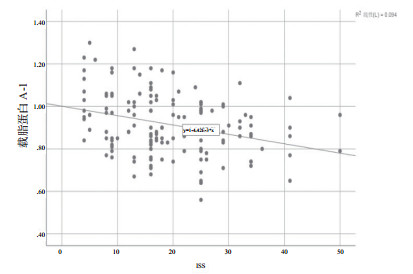 | 图 1 血清载脂蛋白A-1水平与ISS评分的关系(n=38) Fig 1 Relationship between apolipoprotein A-1 level in serum and ISS score (n=38) |