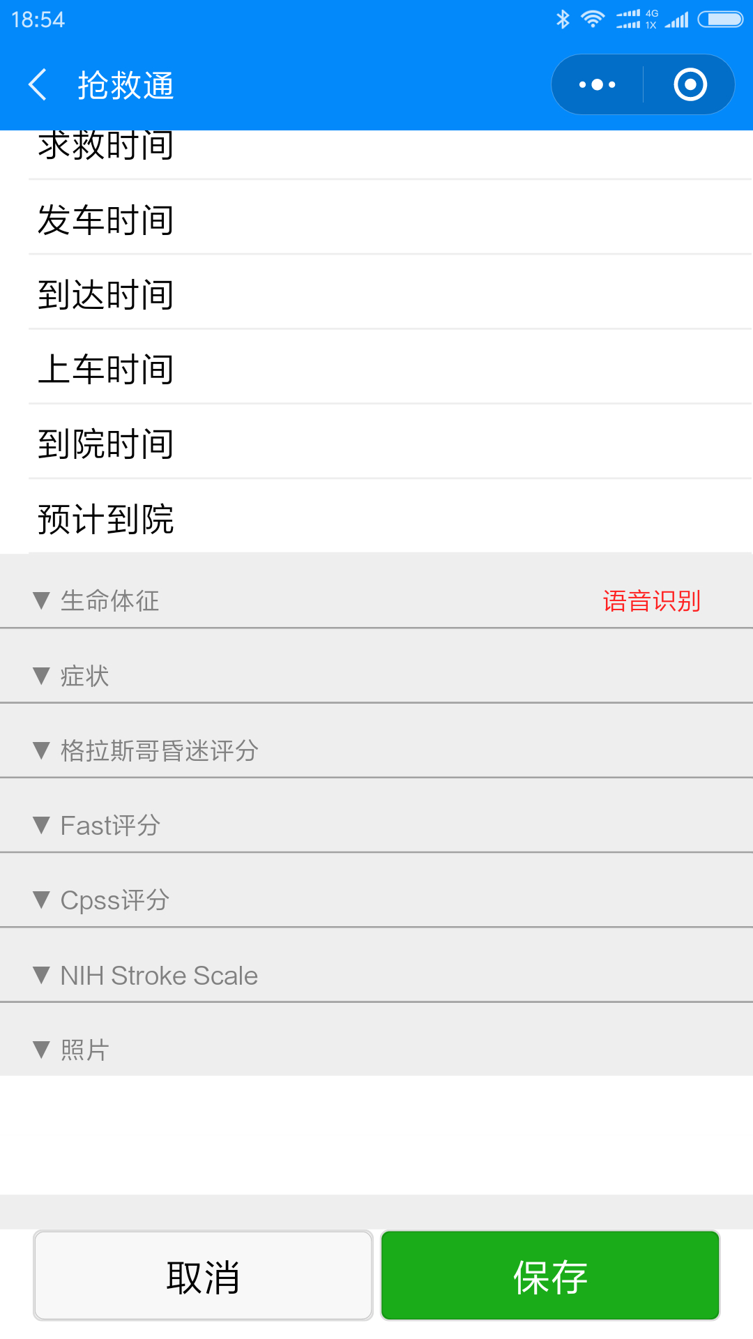 笔者所在医院的卒中中心为国家级卒中中心,笔者发现卒中中心院前急救系统与院内急救系统缺乏实时衔接和协同救治流程,存在脱节现象,有很多患者未能按照治疗指南的要求到达最佳治疗单位,或到达医院后无法及时衔接,大大延误了血管开通的时机。为了能够将疑似卒中患者的院前评估标准化,笔者所在的研发团队设计卒中患者院前急救信息采集小程序——抢救通APP(以下简称APP),并教授院前急救人员使用,反复进行修正,以期达到最佳效果。院前急救人员需要填写发病时间、症状、体征等内容,并对患者进行面臂言语时间评分(face, arm, speech, time, FAST)、辛辛那提院前卒中评分(Cincinnati prehospital stroke scale, CPSS),APP填写界面见图 1~2,APP采用下拉式菜单选择方式填写,尽可能提高使用人员的填写速度。考虑到患者隐私保护问题,APP研发机构向相关网络与平台递交了隐私保护申请,APP研发初步结束后将与医院内网接轨进一步保证患者隐私。