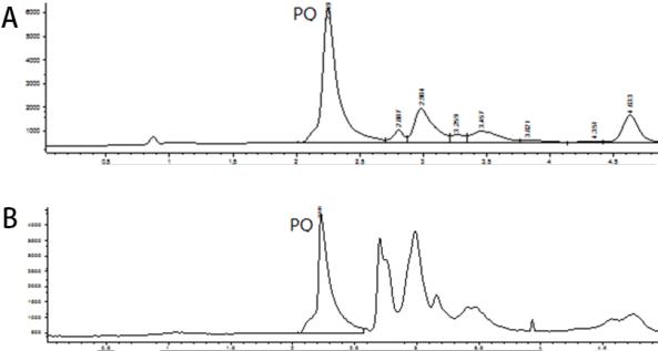 A:血浆;B:肺组织 图 1 百草枯高效液相色谱图 |