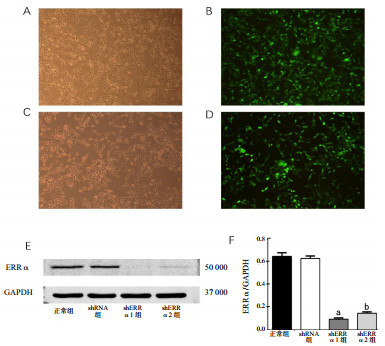 shERRα1组为正常细胞感染shERRα1序列;shERRα2组为正常细胞感染shERRα2序列。正常大鼠PMVECs的细胞形态(A、C)以及感染72 h后,倒置荧光显微镜下观察的绿色荧光蛋白GFP的表达量(B、D)(×100);Western Blot检测四组细胞内ERRα的表达量(E、F);与正常组及shRNA组比较,a P < 0.01;与正常组及shRNA组比较,b P < 0.01 图 1 大鼠PMVECs的形态及感染效率 Fig 1 Infection efficiency and morphology of rat PMVECs |