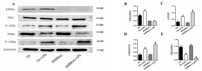 NF-κB通路相关蛋白在四组细胞内的表达水平。A为代表性Western blot技术检测四组细胞中ERRα、p 65, p-p65、P-IKBα、IKBα蛋白的表达水平;B~E为ERRα、p-p65、P-IKBα、IKBα蛋白的定量分析; 与Ctr及shERRα1组比较,a P < 0.05;与Ctr+LPS组比较,b P < 0.05 图 3 ERRα对NF-κB炎症通路的影响 Fig 3 Effect of ERRα on NF-κB inflammatory pathway |