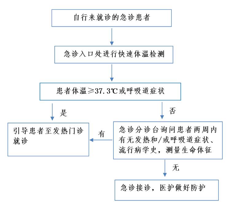 3 改进流程 3.1 普通急诊区域发热及呼吸道症状的筛查及预检分诊:急诊在急诊入口处设置快速体温监测和预检分诊,对所有出入人员进行体温检测,询问流行病学史,如有发热和(或)呼吸道症状,或流行病学接触史等上述之一的情况则引导到发热门诊就诊,如无上述情况则到急诊分诊台进行二次分诊。急诊分诊台再次询问患者的症状及流行病学史,测量生命体征,如初步判断患者不符合新型冠状病毒肺炎筛查指征,则安排在急诊区域就诊,如有发热和/或呼吸道症状,或有流行病学接触史,则转到发热门诊就诊。急诊诊室接诊医生会继续询问患者的症状及流行病学史,如发现有可疑的流行病学史或症状无法排除新冠肺炎则转到发热门诊就诊。