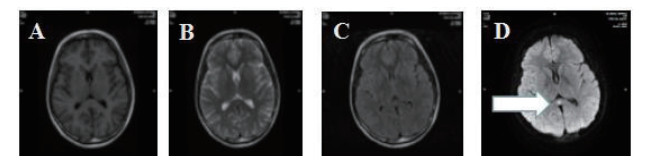 图 1 A.T1序列/B.T2序列/C.FLAIR序列均无异常;D.DWI系列上为高信号(箭头所示) |