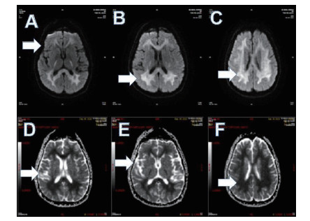2 结果 2.1 基本资料及头颅核磁特征本观察研究最终纳入患者51例,中毒患者的头颅核磁特征表现为:在MRI的常规序列(T1\T2\FLAIR)病灶显示不明显,但在DWI表现为高信号,ADC值下降呈低信号。病变部位主要是胼胝体的压部(所有阳性病例胼胝体压部均受损),病变也可以形成以胼胝体为中心的广泛白质病变,皮质不受损害。见图 1,2。