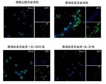 1.2 实验试剂RIPA裂解液、BCA蛋白试剂购自碧云天;重组IL‐29购自R & D公司;凝血酶-抗凝血酶(TAT)ELISA试剂盒购自Assaypro公司;4’,6-二脒基-2-苯吲哚(DAPI),碘化丙啶(PI)购自Sigma公司;人源化抗CD88抗体、小鼠抗人TF单克隆抗体,兔抗人GAPDH多克隆抗体,HRP标记的驴抗小鼠、山羊抗兔多克隆抗体,IgG1抗CD19单克隆抗体,羊抗小鼠的Alexa Fluor 488抗体,均来自Abcam公司。
