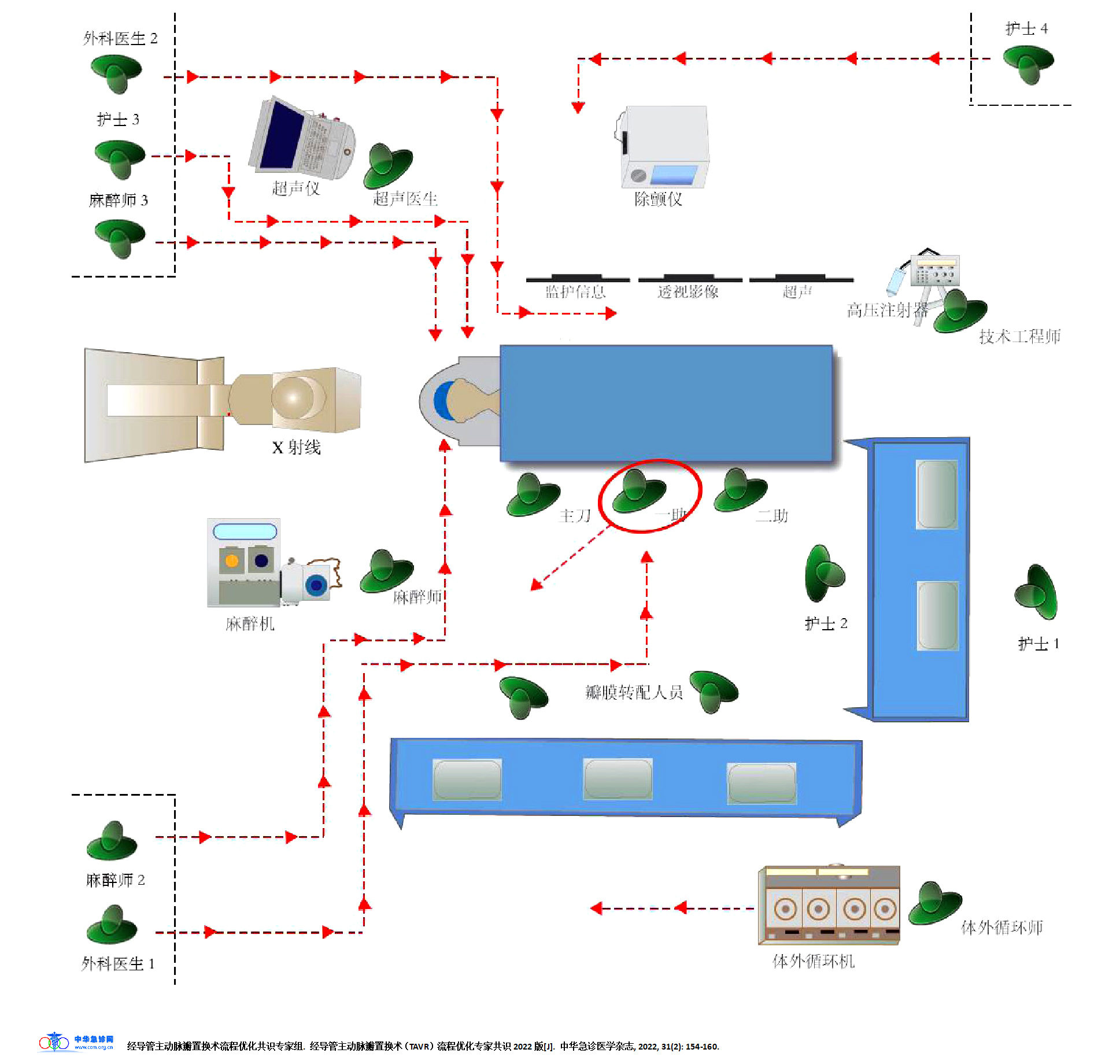 | 图 2 经股动脉路径主动脉瓣置换术中循环崩溃应急流程人员分布及俯视图 |