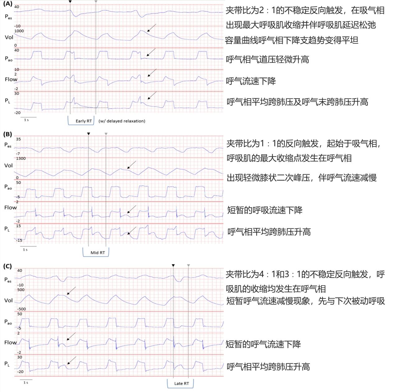截止目前,监测呼吸肌肉活动和准确评估判断吸气努力触发的金标准依然是采用食道压力监测或膈肌电活动监测(EAdi)[17]。但两者均具有相似弊端,即均为有创性操作,均需要高端类型呼吸机监测,对技术要求相对较高,并且均需要特殊耗材,增加患者医疗负担,也从而导致其临床无法大规模普遍性推广。如果没有食管内压监测或者NAVA导管的EAdi监测,识别RT则较为困难。但通过仔细观察呼吸机的各种波形仍有可能发现蛛丝马迹:压力辅助/控制模式下吸气相压力曲线上的负向反折;容量辅助/控制模式下压力平台期的消失;吸气/呼气流速曲线波形偏离预期等,但临床实施耗时耗力,存在很多弊端。
