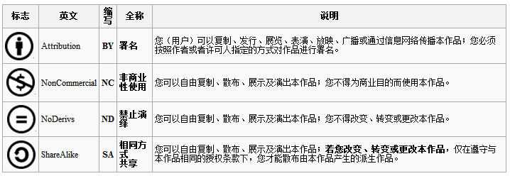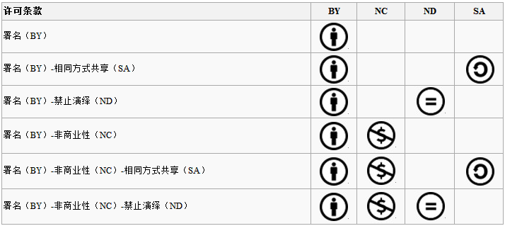 知识共享协议允许作者选择不同的授权条款和根据不同国家的著作权法制定的版权协议,版权持有人可以指定以下的条件:(以下条件均不适用于原始创作者)
