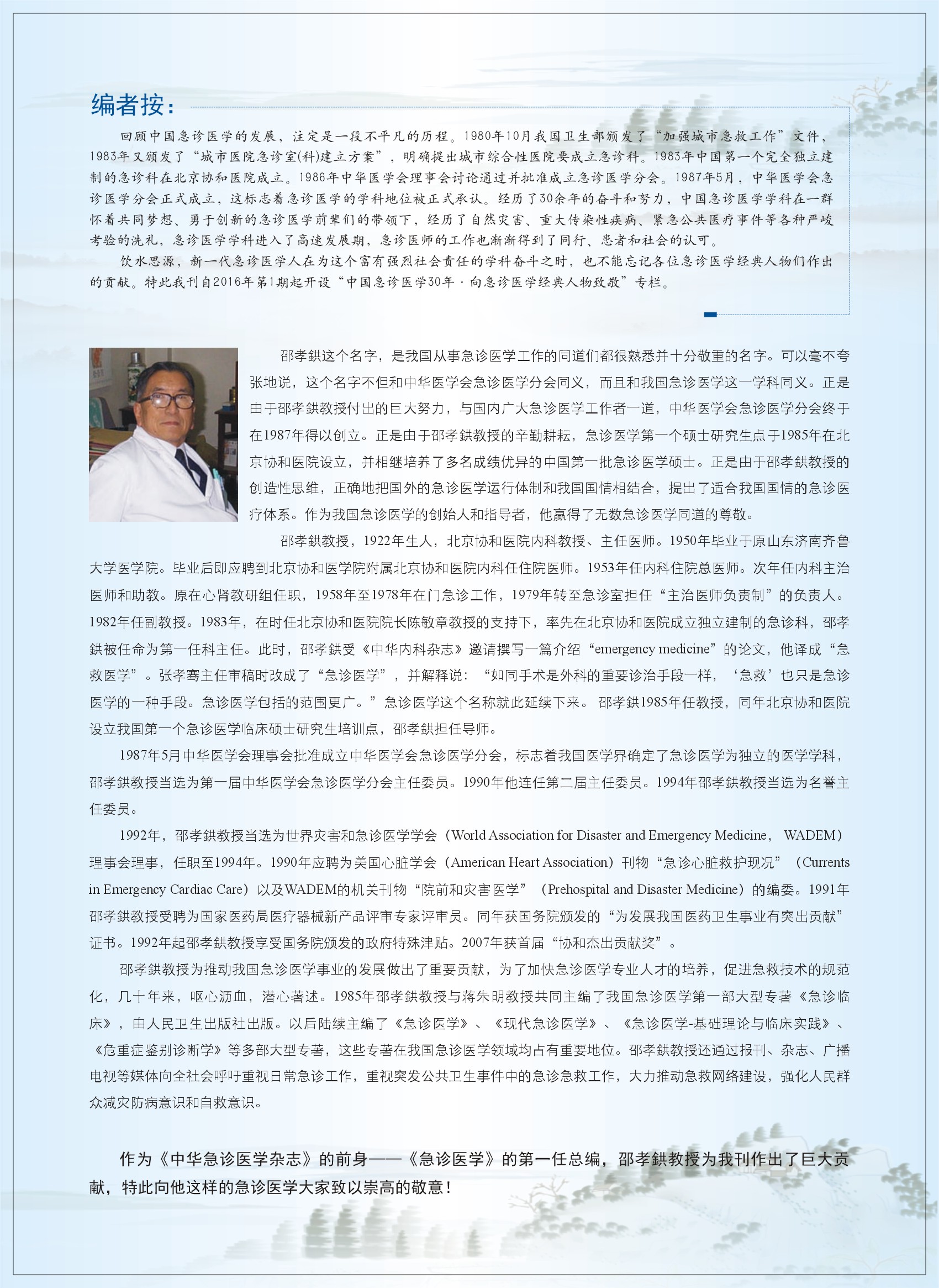 作为《中华急诊医学杂志》的前身——《急诊医学》的第一任总编,邵孝鉷教授为我刊作出了巨大贡献,特此向他这样的急诊医学大家致以崇高的敬意!