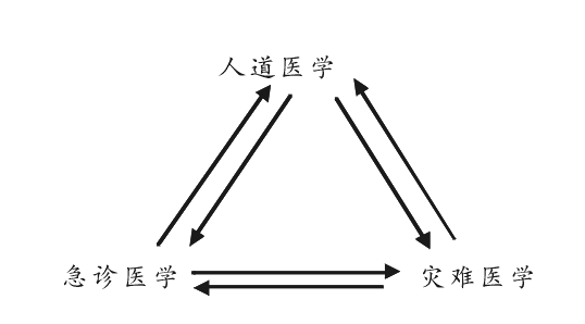 他还提出,急诊医学、灾难医学和人道医学三者关系密切,形成了一个三角: