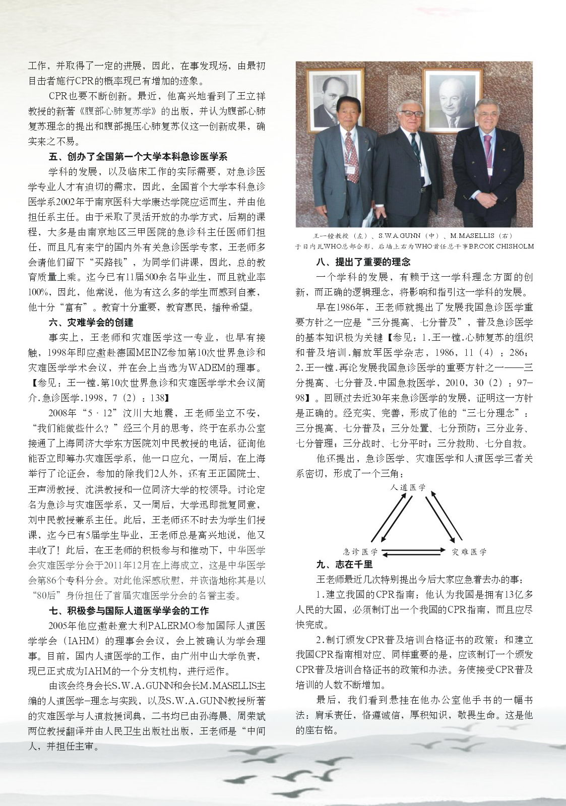 2008年“5·12”汶川大地震,王老师坐立不安,“我们能做些什么?”经三个月的思考,终于在系办公室接通了上海同济大学东方医院刘中民教授的电话,征询他能否立即筹办灾难医学系,他一口应允,一周后,在上海举行了论证会,参加的除我们2人外,还有王正国院士、王声湧教授、沈洪教授和一位同济大学的校领导。讨论定名为急诊与灾难医学系,又一周后,大学迅即批复同意,刘中民教授兼系主任。此后,王老师还不时去为学生们授课,迄今已有5届学生毕业,王老师总是高兴地说,他又丰收了!此后,在王老师的积极参与和推动下,中华医学会灾难医学分会于2011年12月在上海成立,这是中华医学会第86个专科分会。对此他深感欣慰,并诙谐地称其是以“80后”身份担任了首届灾难医学分会的名誉主委。