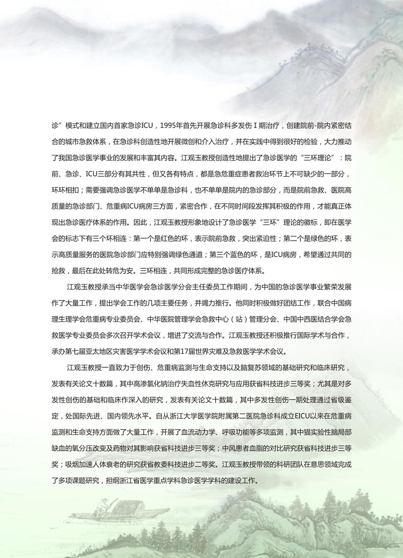 江观玉教授是中华医学会急诊医学分会的主要创始人之一,是我国急诊医学事业的开创者之一。江观玉教授在1984年创建国内首批急诊科之一,提出很多创造性的见解和理论:率先提出“二线急诊”模式和建立国内首家急诊ICU,1995年首先开展急诊科多发伤Ⅰ期治疗,创建院前-院内紧密结合的城市急救体系,在急诊科创造性地开展微创和介入治疗,并在实践中得到很好的检验,大力推动了我国急诊医学事业的发展和丰富其内容。江观玉教授创造性地提出了急诊医学的“三环理论”:院前、急诊、ICU三部分有其共性,但又各有特点,都是急危重症患者救治环节上不可缺少的一部分,环环相扣;需要强调急诊医学不单单是急诊科,也不单单是院内的急诊部分,而是院前急救、医院高质量的急诊部门、危重病ICU病房三方面,紧密合作,在不同时间段发挥其积极的作用,才能真正体现出急诊医疗体系的作用。因此,江观玉教授形象地设计了急诊医学“三环”理论的徽标,即在医学会的标志下有三个环相连:第一个是红色的环,表示院前急救,突出紧迫性;第二个是绿色的环,表示高质量服务的医院急诊部门应特别强调绿色通道;第三个蓝色的环,是ICU病房,希望通过共同的抢救,最后在此处转危为安。三环相连,共同形成完整的急诊医疗体系。