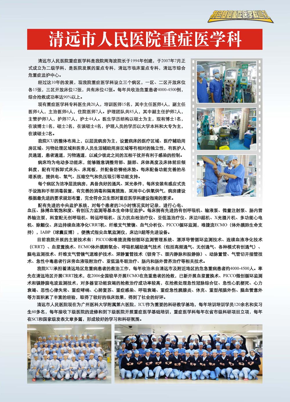 清远市人民医院重症医学科是我院周海波院长于1994年创建,于2007年7月正式成立为二级学科,是医院发展的重点专科,清远市临床重点专科,清远市综合危重症监护中心。