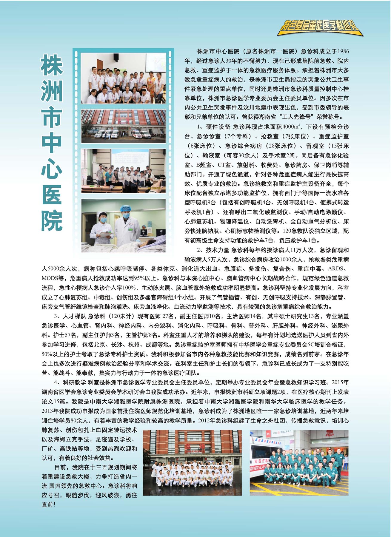 株洲市中心医院(原名株洲市一医院)急诊科成立于1986年,经过急诊人30年的不懈努力,现在已形成集院前急救、院内急救、重症监护于一体的急救医疗服务体系。承担着株洲市大多数急危重症病人的救治,是株洲市卫生局指定的突发公共卫生事件紧急处理的重点单位,同时还是株洲市急诊科质量控制中心挂靠单位,株洲市急诊医学专业委员会主任委员单位。因多次在市内公共卫生突发事件及汶川地震中表现出色,受到市委领导的表彰和兄弟单位的认可。曾获得湖南省“工人先锋号”荣誉称号。