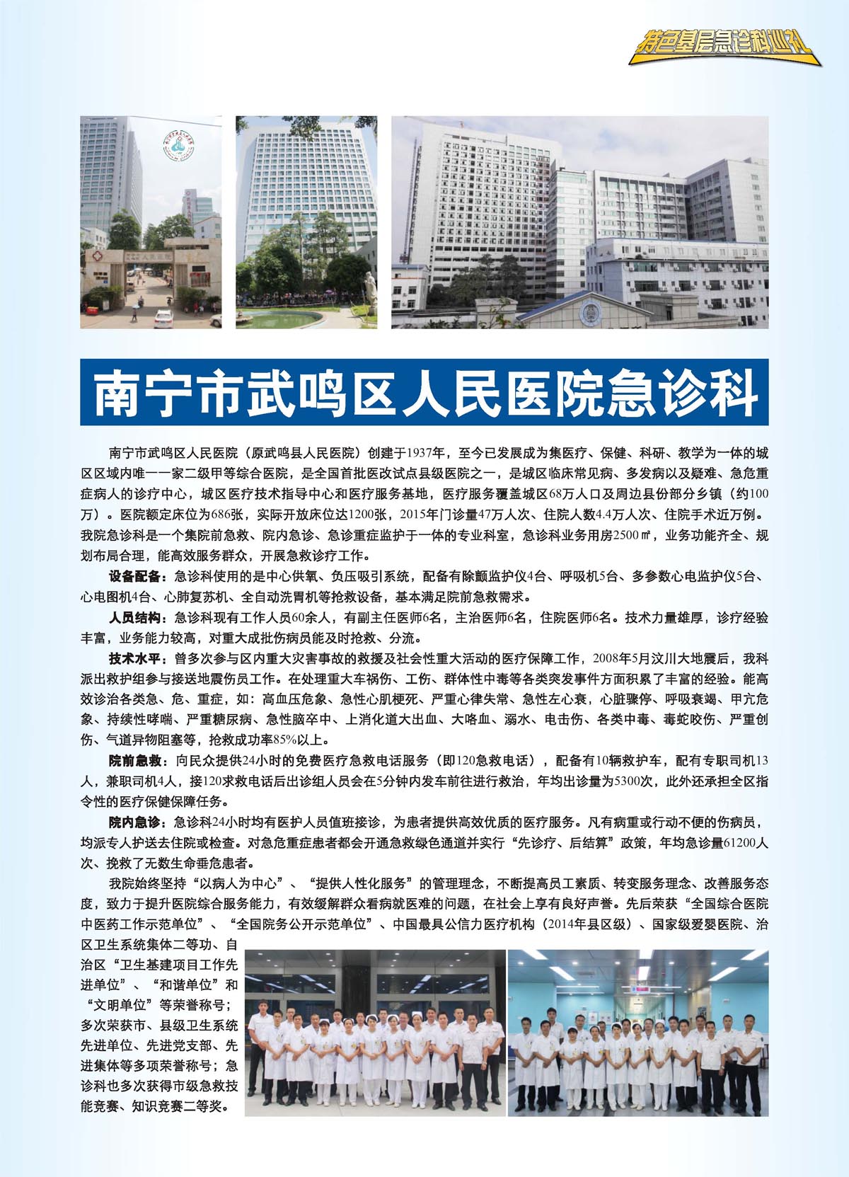 南宁市武鸣区人民医院(原武鸣县人民医院)创建于1937年,至今已发展成为集医疗、保健、科研、教学为一体的城区区域内唯一一家二级甲等综合医院,是全国首批医改试点县级医院之一,是城区临床常见病、多发病以及疑难、急危重症病人的诊疗中心,城区医疗技术指导中心和医疗服务基地,医疗服务覆盖城区68万人口及周边县份部分乡镇(约100万)。医院额定床位为686张,实际开放床位达1200张,2015年门诊量47万人次、住院人数4.4万人次、住院手术近万例。我院急诊科是一个集院前急救、院内急诊、急诊重症监护于一体的专业科室,急诊科业务用房2500㎡,业务功能齐全、规划布局合理,能高效服务群众,开展急救诊疗工作。