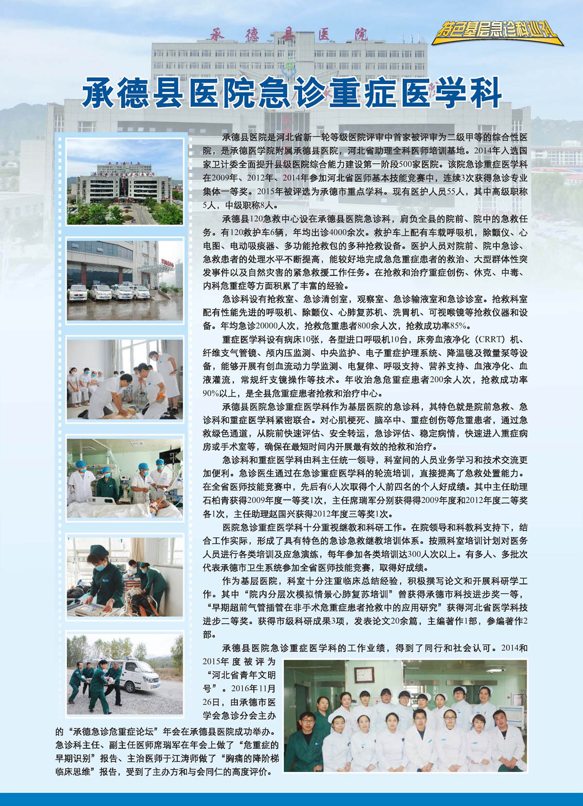 承德县医院急诊重症医学科作为基层医院的急诊科,其特色就是院前急救、急诊科和重症医学科紧密联合。对心肌梗死、脑卒中、重症创伤等危重患者,通过急救绿色通道,从院前快速评估、安全转运,急诊评估、稳定病情,快速进入重症病房或手术室等,确保在最短时间内开展最有效的抢救和治疗。