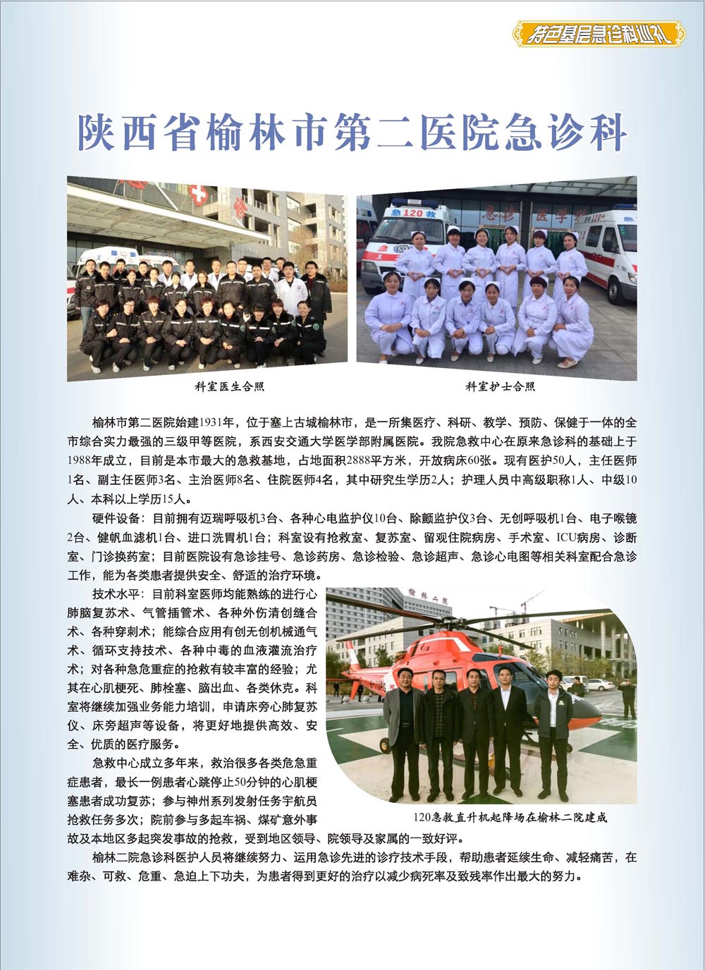 榆林市第二医院始建1931年,位于塞上古城榆林市,是一所集医疗、科研、教学、预防、保健于一体的全市综合实力最强的三级甲等医院,系西安交通大学医学部附属医院。我院急救中心在原来急诊科的基础上于1988年成立,目前是本市最大的急救基地,占地面积2888平方米,开放病床60张。现有医护50人,主任医师1名、副主任医师3名、主治医师8名、住院医师4名,其中研究生学历2人;护理人员中高级职称1人、中级10人、本科以上学历15人。