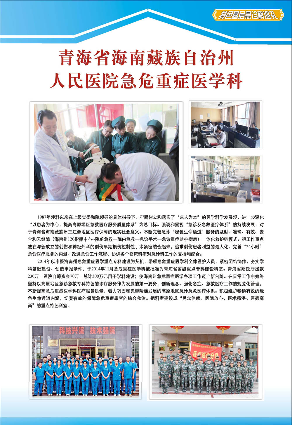 2014年以申报海南州急危重症医学重点专科建设为契机,带领急危重症医学科全体医护人员,紧密团结协作,夯实学科基础建设、创造申报条件,于2014年11月急危重症医学科被批准为青海省省级重点专科建设科室。青海省财政厅拨款230万,医院自筹资金70万,总计300万元用于学科建设;使海南州急危重症医学各项工作迈上新台阶。在日常工作中始终坚持以高原地区急诊急救专科特色的诊疗服务作为发展的第一要务,创新理念、强化急症、急救医疗工作的规范化管理,不断提高急危重症医学科医疗服务质量,着力巩固和完善阶梯发展的高原地区急诊急救医疗体系。积极维护畅通有效的绿色生命通道内涵,切实有效的保障急危重症患者的综合救治。把科室建设成“民众信赖、医院放心、医术精湛、医德高尚”的重点特色科室。