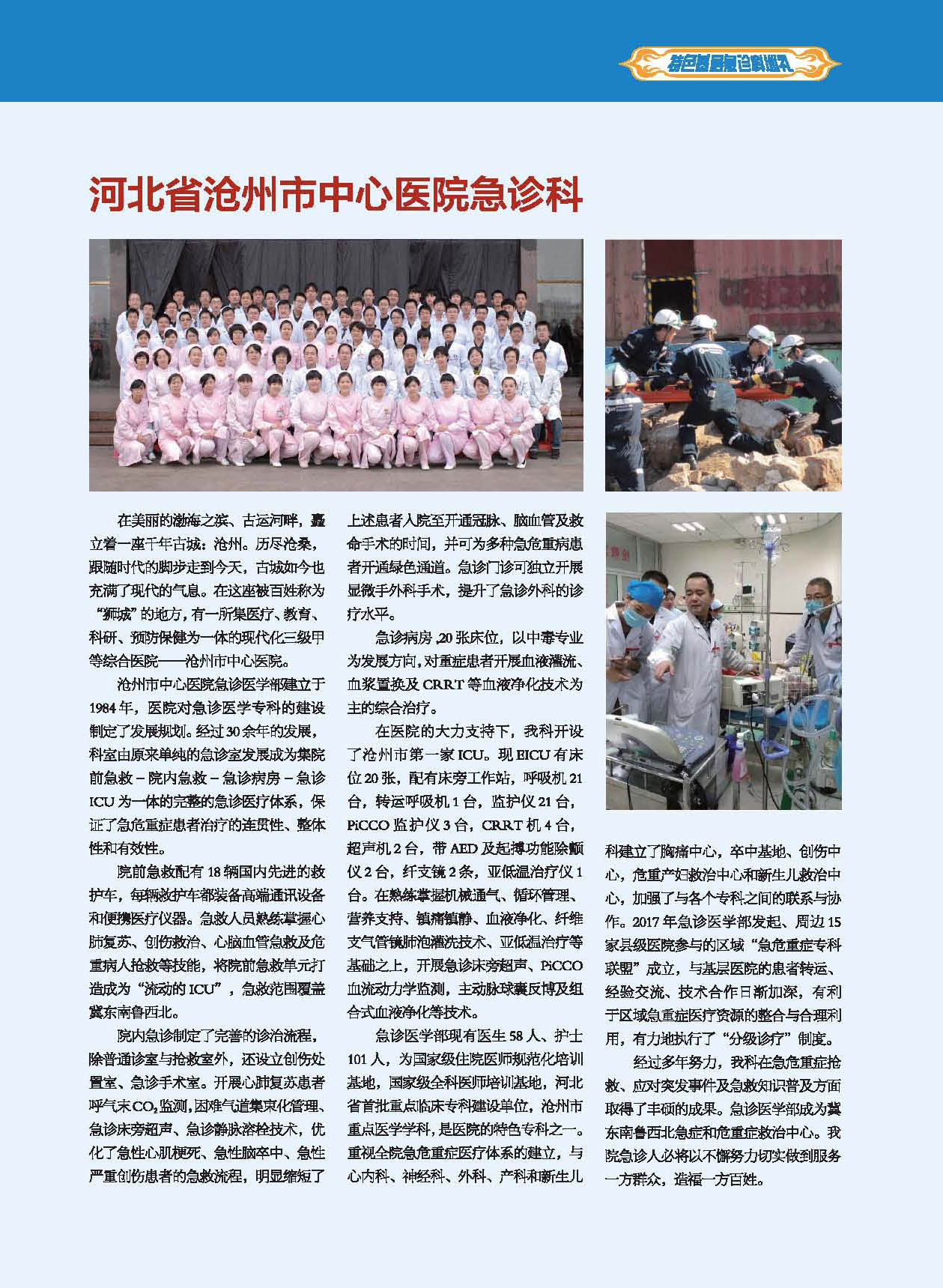 沧州市中心医院急诊医学部建立于1984年,医院对急诊医学专科的建设制定了发展规划。经过30余年的发展,科室由原来单纯的急诊室发展成为集院前急救-院内急救-急诊病房-急诊ICU为一体的完整的急诊医疗体系,保证了急危重症患者治疗的连贯性、整体性和有效性。