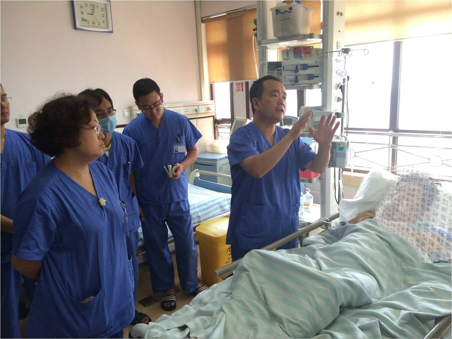 在医院的大力支持下,我科开设了沧州市第一家ICU。现EICU有床位20张,配有床旁工作站,呼吸机21台,转运呼吸机1台,监护仪21台,PiCCO监护仪3台,CRRT机4台,超声机2台,带AED及起搏功能除颤仪2台,纤支镜2条,亚低温治疗仪1台。在熟练掌握机械通气、循环管理、营养支持、镇痛镇静、血液净化、纤维支气管镜肺泡灌洗技术、亚低温治疗等基础之上,开展急诊床旁超声、PiCCO血流动力学监测,主动脉球囊反博及组合式血液净化等技术。