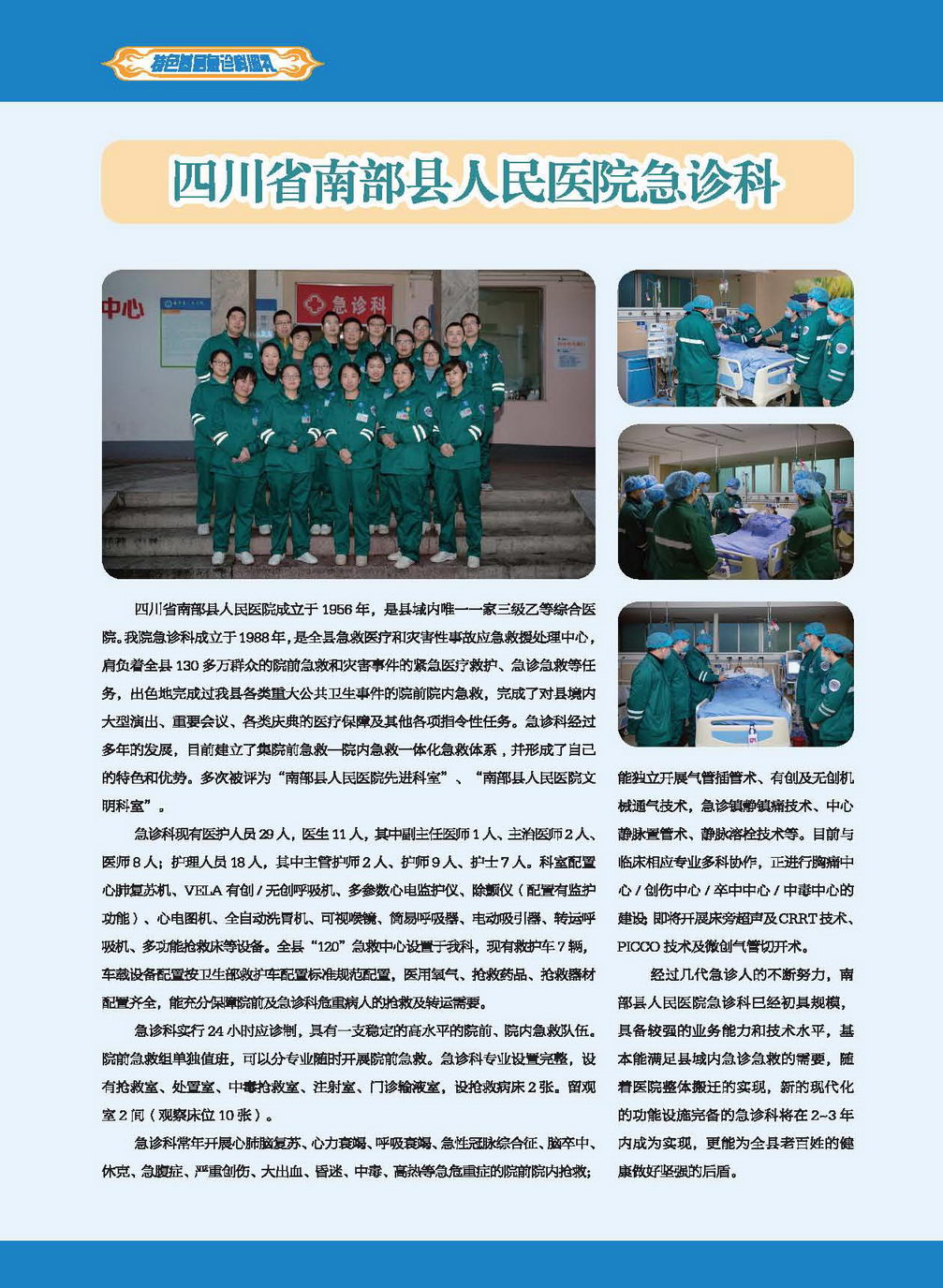 四川省南部县人民医院成立于1956年,是县域内唯一一家三级乙等综合医院,我院急诊科成立于1988年,是全县急救医疗和灾害性事故应急救援处理中心。肩负着全县130多万群众的院前急救和灾害性事故的紧急医疗救护、急诊急救等任务。出色地完成过我县各类重大公共卫生事件的院前院内急救,完成了对县境内大型演出、重要会议、各类庆典的医疗保障及其他各项指令性任务。急诊科经过多年的发展,目前建立了集院前急救—院内急救一体化急救体系,并形成了自己的特色和优势。多次被评为“南部县人民医院先进科室”“南部县人民医院文明科室”。