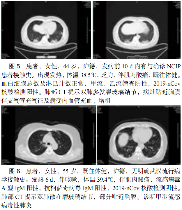 10例确诊患者影像学改变:有磨玻璃影(9例),病灶可为单侧(1例)或者双侧且(9例)病灶贴近胸膜为主(9例),有结节影(1例),无坏死灶出现,可合并有胸腔积液(1例)。14例排除患者影像学改变:4例患者出现磨玻璃影,病灶10例为单侧,4例为双侧,1例结节影。且病灶较散发,无坏死灶出现,无胸腔积液,见表2。2.3 典型案例肺部CT改变结果5例确诊NCP病例肺部CT见图1~5。3例排除NCP病例肺部CT见图6~8。