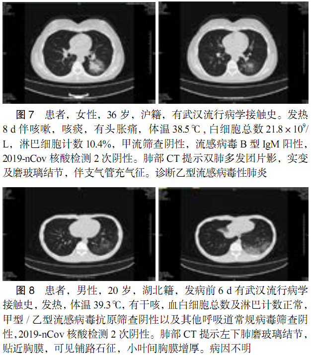 本研究中10例NCP患者中8例有武汉流行病学接触史,有2例无明确流行病学接触史,后者其中一例患者由于家人重病住院,发病前半个月一直每天往返于某大医院、超市不除外有不知情接触NCP患者的可能,另外一例亦无明确的流行病学史,有每天菜场超市购物史,不排除在公共场合感染可能[8]。发病初期NCP均为轻症患者,仅有一例患者有慢性肾炎病史,其余患者均无基础疾病。患者年龄在24~65岁,属于轻中年人,活动范围大,可能也是一个因素。NCP临床症状不典型[9],高热起病者少,无基础疾病者一般临床表现多为中等度发热、干咳、乏力,很少有鼻塞、流涕、打喷嚏或喉咙痛的等上呼吸道感染症状[10]。排除组14例病毒性肺炎患者,亦均有明确流行病学史,除一例患者有高血压外,均无基础疾病,为身体健康人群,年龄18~65岁,与确诊组相比无明显差别,临床病史特点亦无特殊。影像学特点分析,均具病毒性肺炎的影像学特点[11-14],可有磨玻璃影,病灶可累及单侧及双侧,病灶贴近胸膜等。从影像学特征均符合病毒性肺炎特征,不同病毒引起者影像学上很难区分。因此2019-nCoV核酸检测是确诊的关键[15]。14例排除组患者给出两点提示:一是可能接触到了确诊患者,但由于个人防护做得较好,未被传染。二是虽然有流行病史,但没有直接接触到NCP患者呼吸道分泌物。有报道称,2019-nCoV肺炎患者可有腹泻症状,且在粪便中检测到2019-nCoV,本组患者未观察到此现象。综上所述,本研究发现NCP患者并非要有直接的流行病学史。在大型医院,特别是有发热患者的医院频繁活动也有可能在不知情的情况下被感染。虽然没有接触NCP患者也要高度防护。从CT影像学上看NCP并没有有别于其他病毒性肺炎的特殊表现。2019-nCoV并非感染老弱病患者,而是在中年人中更多见,可能与中年人活动范围更大、旅行、工作接触人员更多有关。