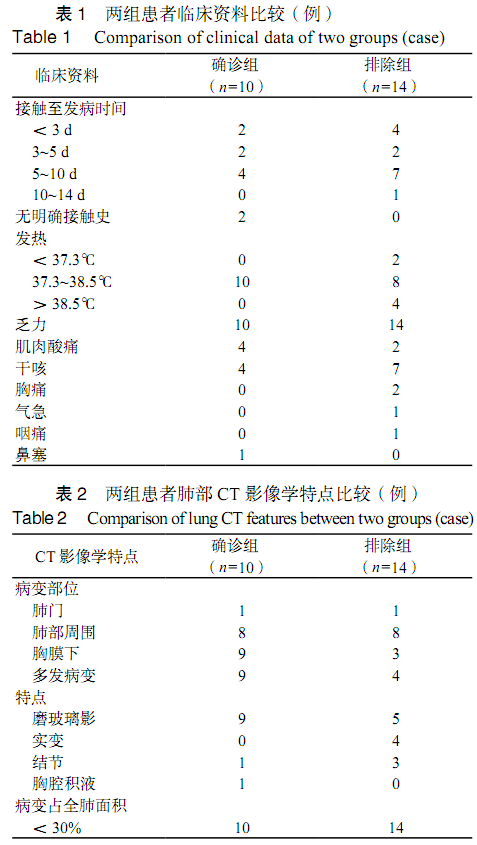 2.1 两组患者临床情况分析本组纳入的24例患者早期均为轻症,血气分析正常。10例确诊患者,男性5例,均有发热、乏力,体温37.5~38.5℃,4例有干咳。其中2例患者无明确疫区流行病接触史,但其中一例男性患者在发病前2周,因妻子住院陪护有每天往返大型医院、超市病史;另一例女性患者有菜场买菜史。其余8例有赴疫区或确诊患者接触史,接触至发病时间为1~10d。