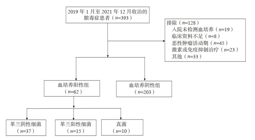 纳入标准:(1)年龄≥18岁;(2)符合2016年美国危重病学会/欧洲危重病医学会脓毒症及脓毒性休克定义及诊断标准-3.0[11]:对于感染或疑似感染患者,序贯器官衰竭评分(sequential organ failure assessment, SOFA)评分≥2分[12]。排除标准:(1)年龄 < 18岁;(2)免疫系统功能缺陷(原发性免疫抑制病、获得性免疫缺陷、长期服用免疫抑制剂、长期服用糖皮质激素、器官移植术后);(3)慢性肝、肾功能疾病终末期;(4)恶性肿瘤活动期;(5)患有严重血液病(骨髓增生异常综合征、多发性骨髓瘤、白血病等);(6)入院24 h内死亡或资料不全;(7)糖尿病急症(糖尿病酮症酸中毒、糖尿病高渗性昏迷或低血糖);(8)入院24 h内未测血糖;(9)药物、急性胰腺炎、内分泌肿瘤、放疗等引起的一过性高血糖;(10)入院后未采样血培养。