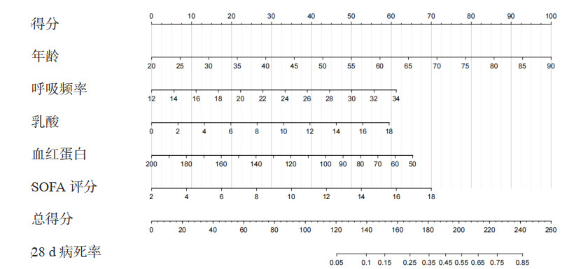 图 1 预测脓毒症相关谵妄患者28 d死亡的列线图 Fig 1 Nomogram for predicting 28-day mortality of patients with SAD |