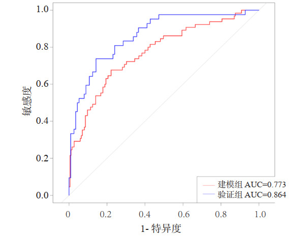 图 2 建模组和验证组中预测模型的受试者工作特征(ROC)曲线 Fig 2 ROC curve of prediction model between the training and validation cohorts |