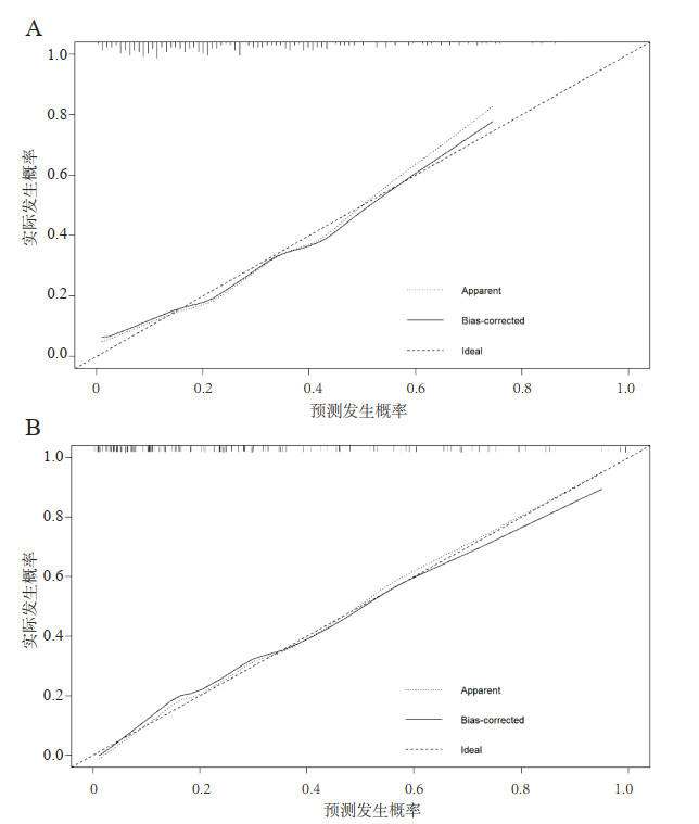 图 3 建模组(A)和验证组(B)中列线图模型的校准曲线 Fig 3 Calibration curve of nomogram between the training(A) and validation(B) cohorts |