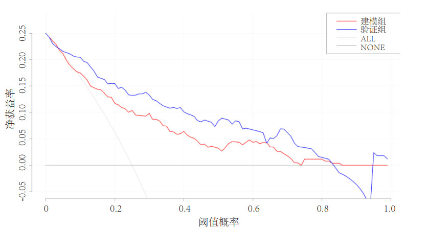 图 4 建模组和验证组中列线图模型的决策曲线 Fig 4 Decision curve of nomogram between the training and validation cohorts |