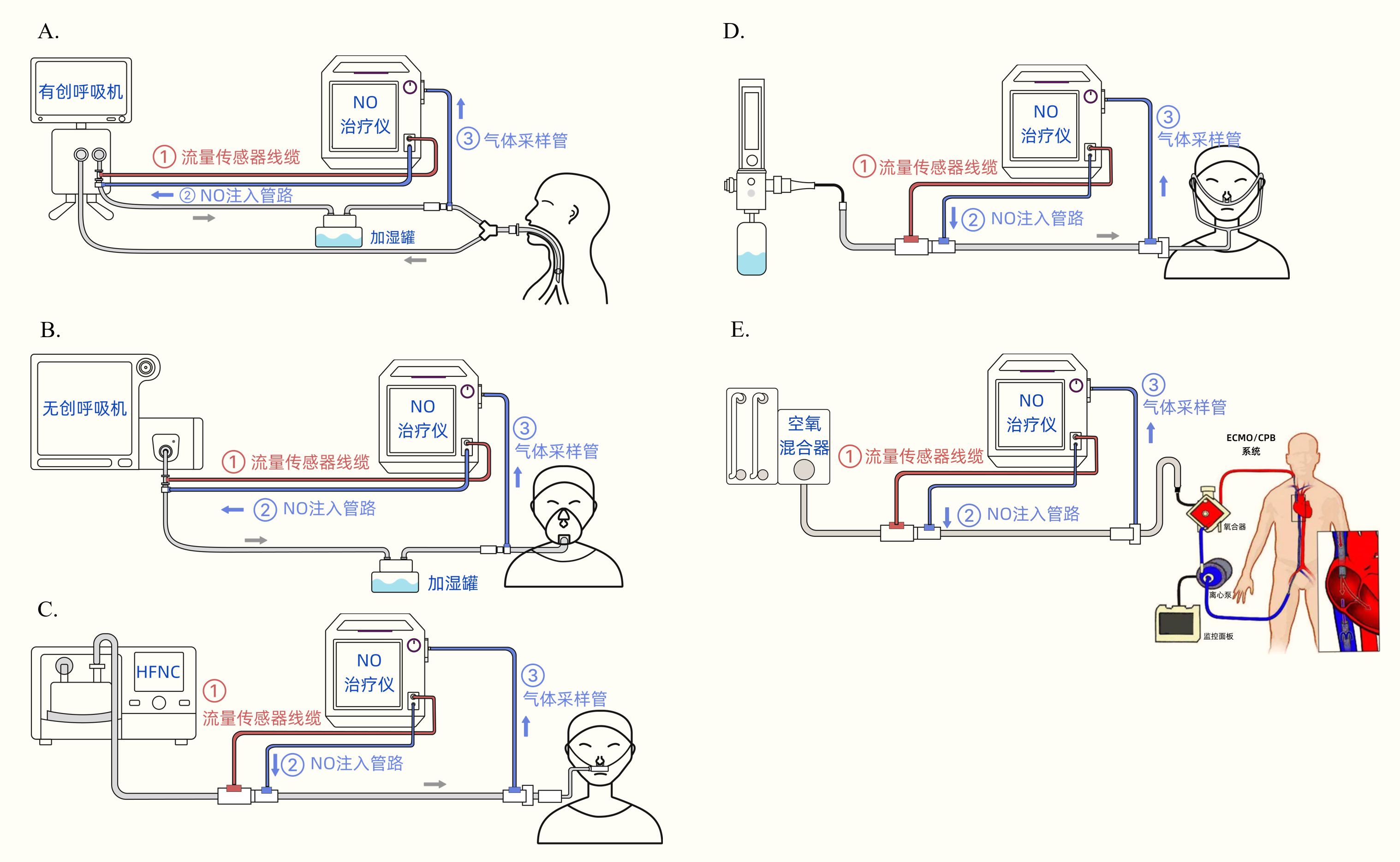 3 一氧化氮与呼吸/生命支持类设备联合使用iNO设备通过与空气源/氧源、呼吸支持类设备以及生命支持类设备连接,输送NO进入体内,以实现治疗目的。iNO设备与临床常用呼吸/生命支持类设备的连接操作示意图见图 1。